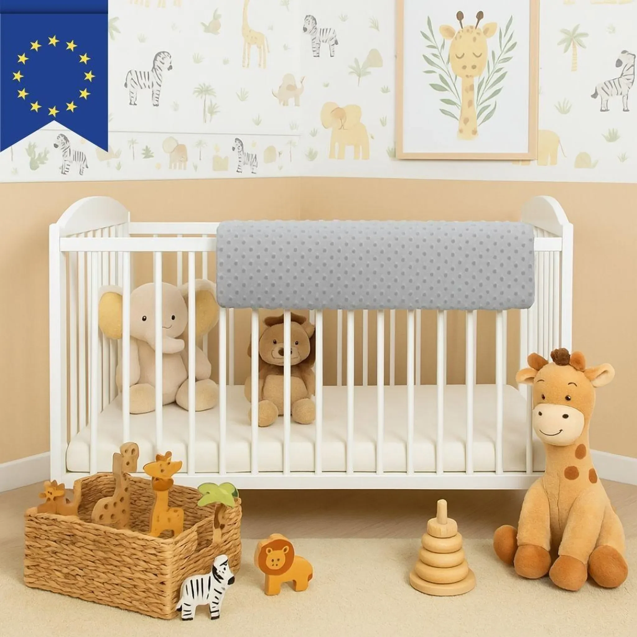 Highlights: Universell einsetzbarer Kantenschutz, weicher und atmungsaktiver Stoff, abnehmbarer Bezug, pflegeleicht, dekorativ und komfortabel, schützt Kinder vor Stößen und sorgt für sicheren Schlaf.