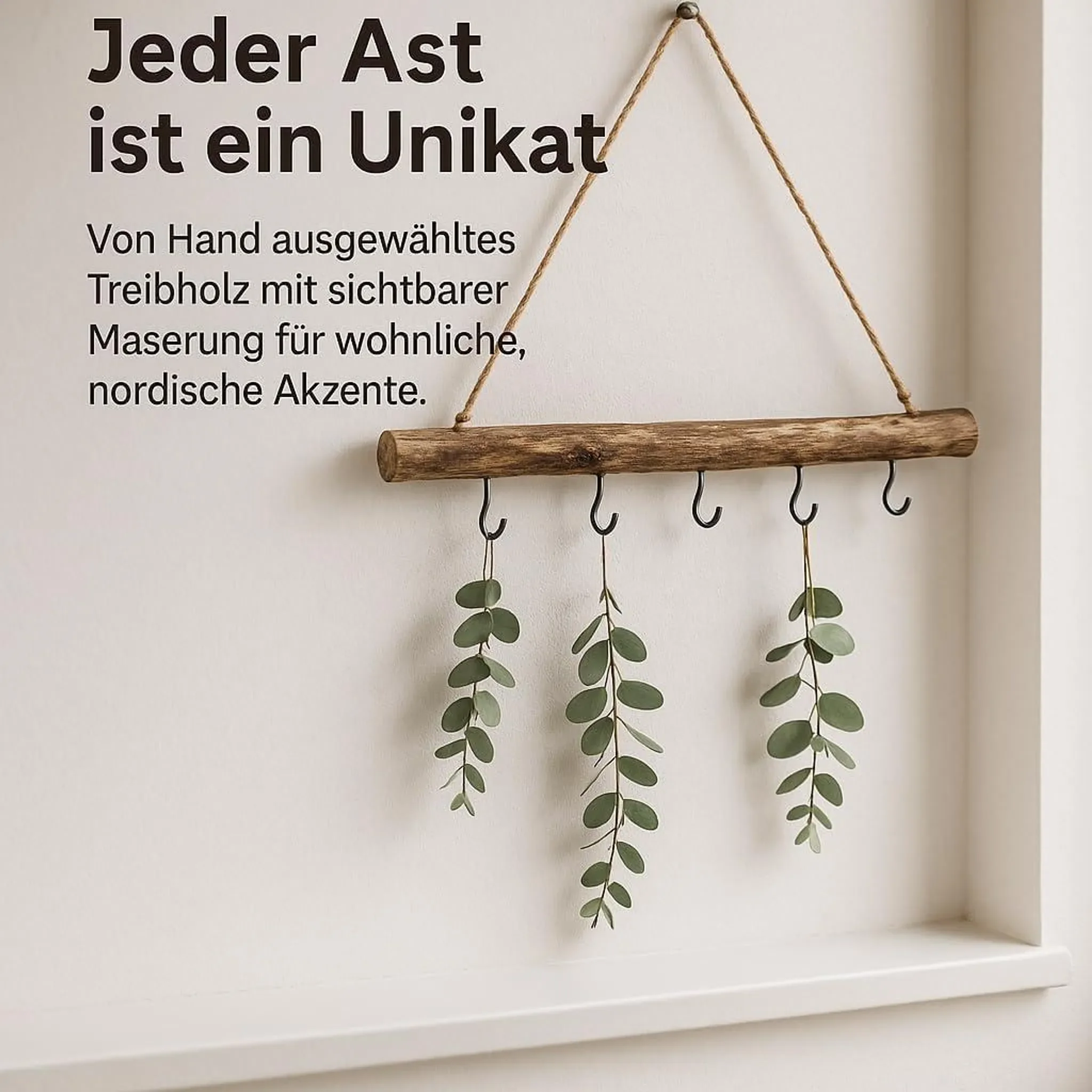 Produktinformationen "Deko-Holzstange zum Hängen – 50 cm mit 5 Haken & Naturkordel"