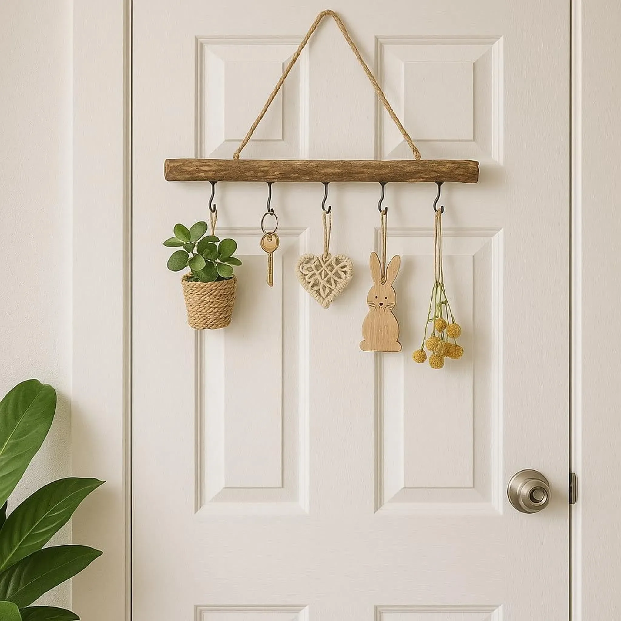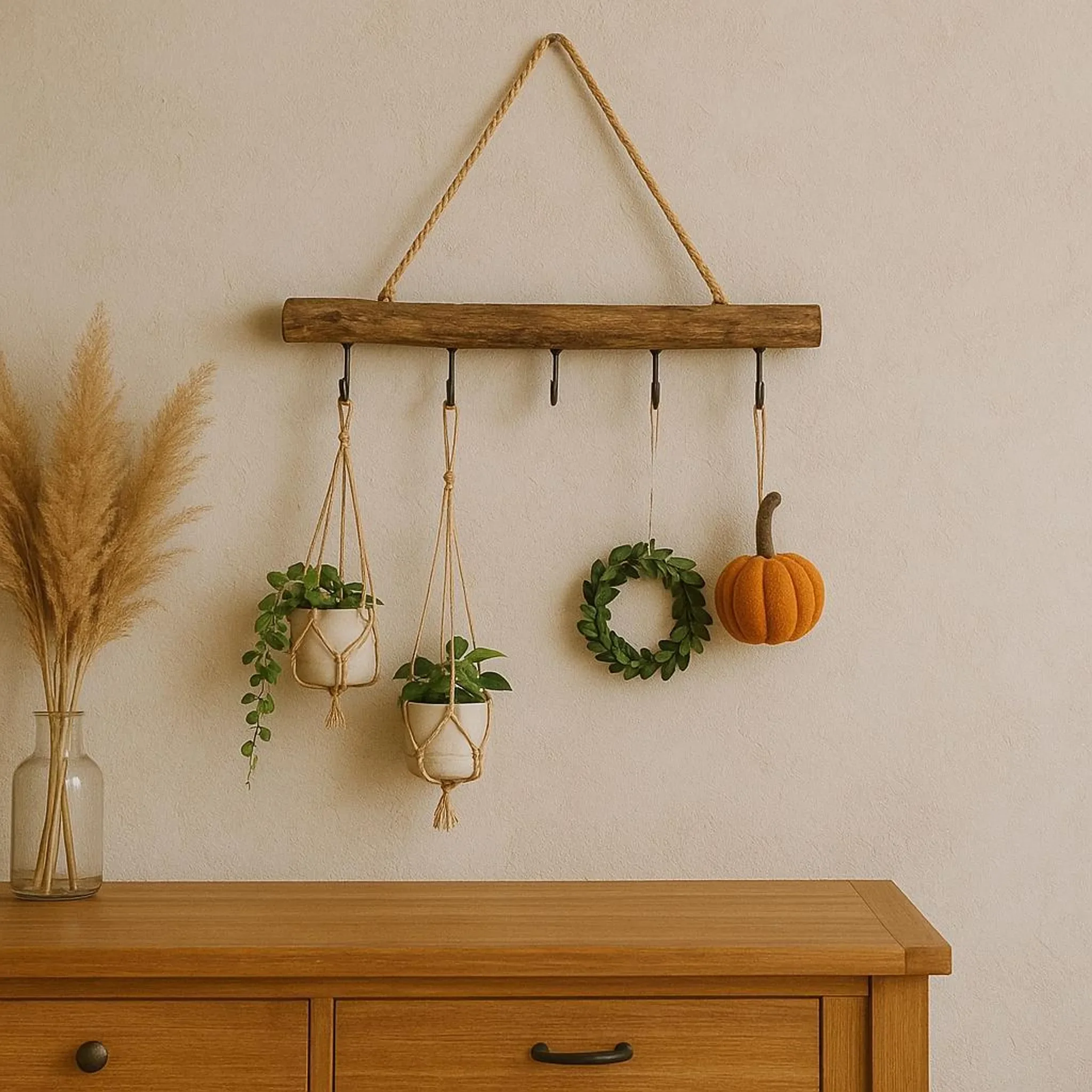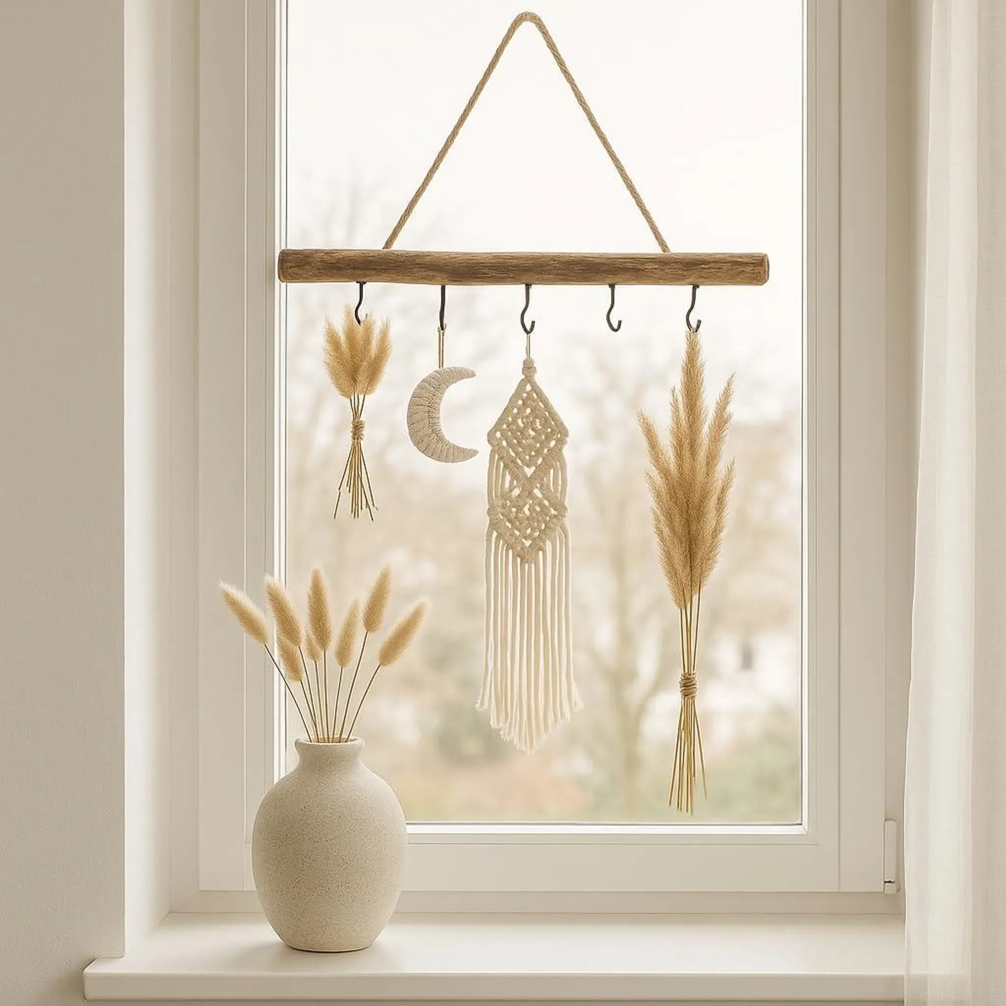 Die fünf integrierten Haken bieten vielfältige Möglichkeiten zum Aufhängen von Dekoelementen wie kleinen Vasen, Trockenblumen, Muschelketten oder saisonalen Accessoires. Ob als Fensterdekoration, Türhänger oder kreativer Wandakzent – diese Holzstange lässt sich flexibel einsetzen und immer wieder neu gestalten.