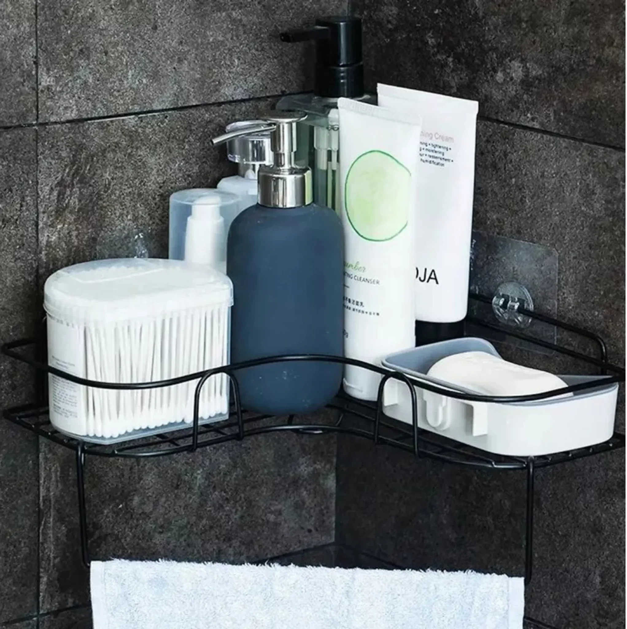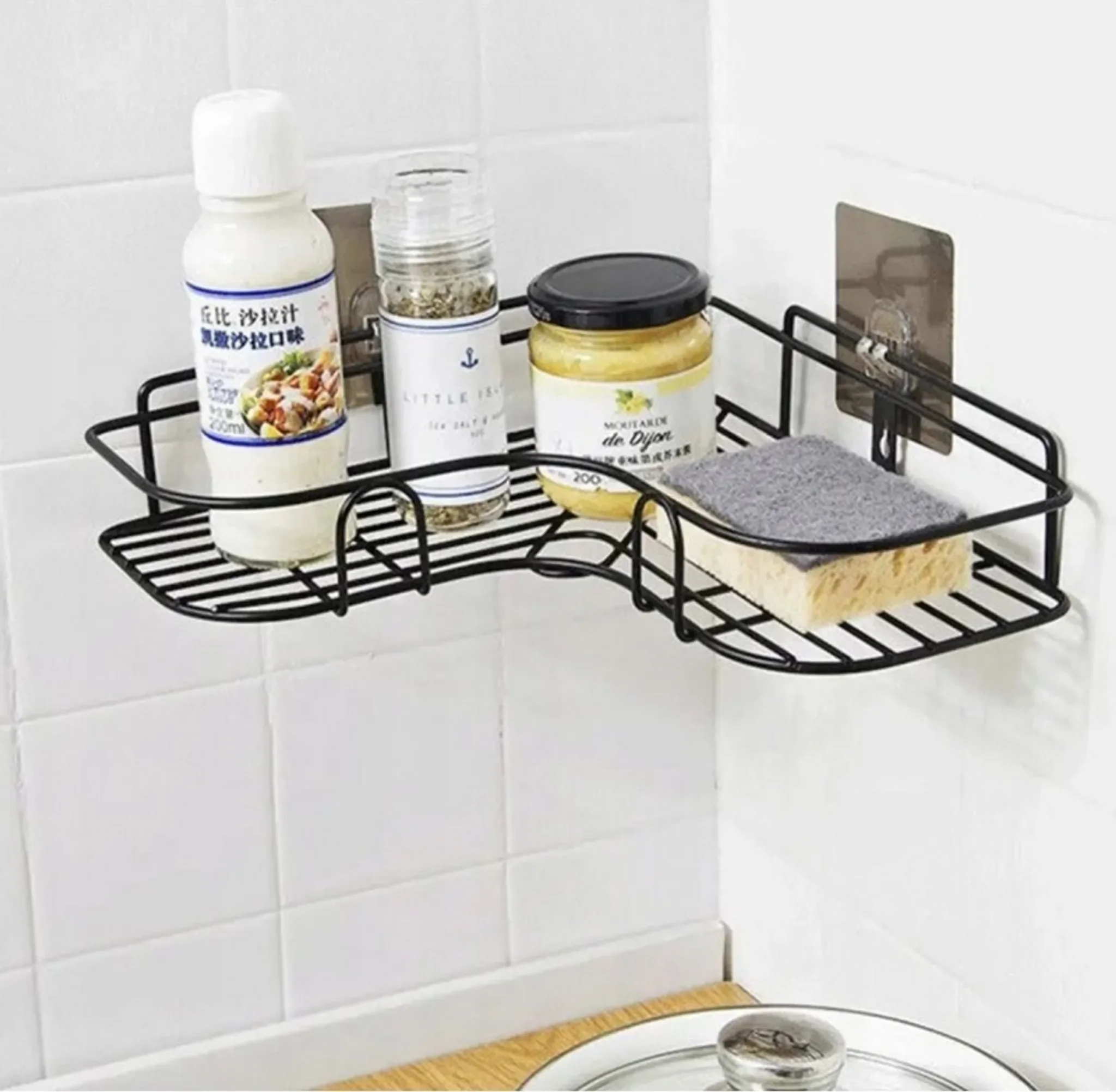 Highlights: Platzsparende Eckmontage, modernes schwarzes Design, wasserabweisende Konstruktion, erhöhte Frontkante für sicheren Halt, vielseitig für Bad und Küche.
