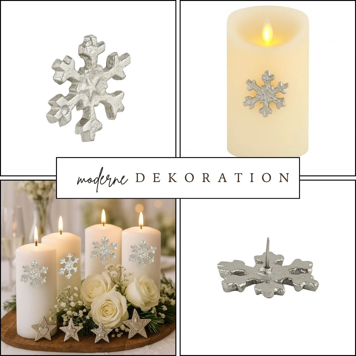 Die edle Silberoptik sorgt für eine festliche Ausstrahlung und lässt sich vielseitig kombinieren – ob mit klassischen Stumpenkerzen, schlanken Stabkerzen oder modernen LED-Kerzen. Durch den praktischen Steckmechanismus ist der Kerzenpin schnell angebracht und sitzt sicher in der Kerze.