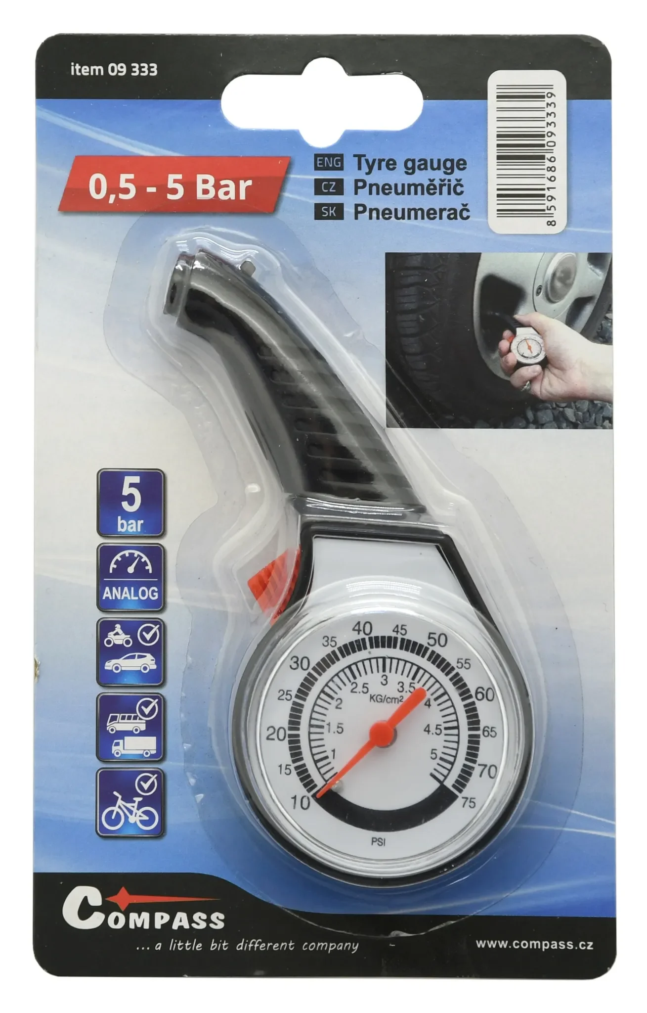 Das pneumatische Manometer von Kompass ermöglicht eine einfache und genaue Überprüfung des Reifendrucks. Ideal für alle Fahrzeuge und Reifenarten.